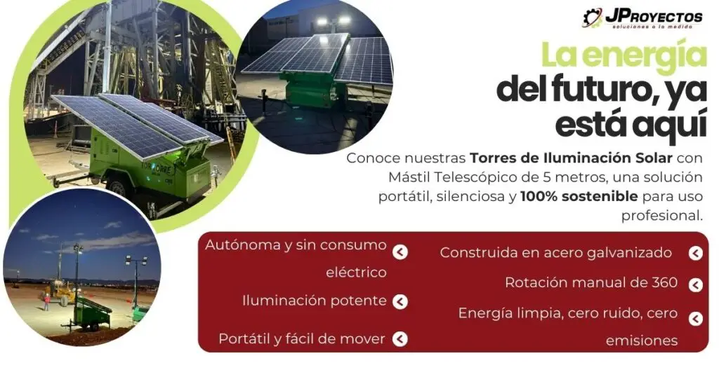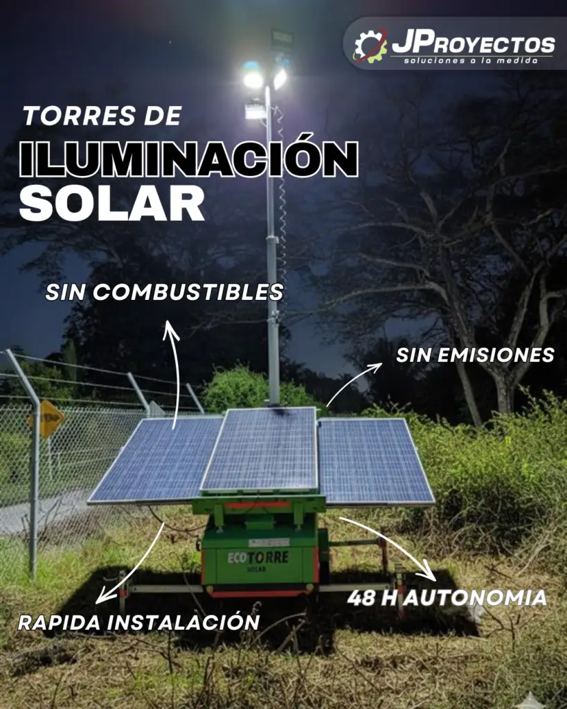 Descubre la torre de iluminación solar ideal para tu proyecto. Energía 100% renovable, alta eficiencia y sin costos operativos. 💡 Perfecta para construcción, minería y eventos. 📞 Llámanos al +573005434814 o visita www.jproyectos.com.co para más información. 🚀🌍